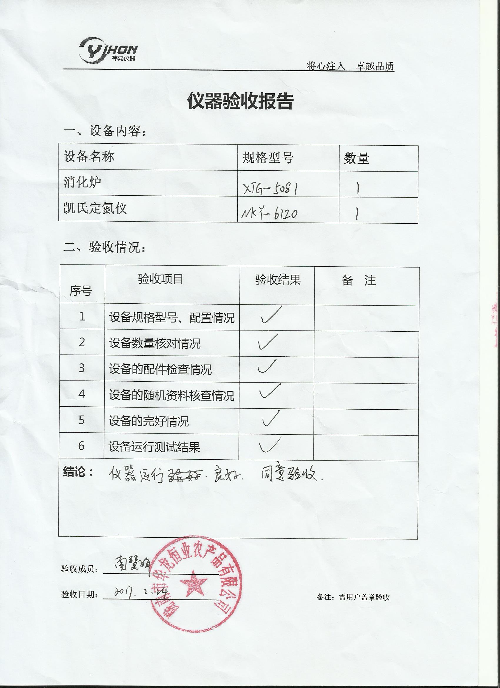 隴南市華龍恒業農產品有限公司對凱氏定氮儀通過多方比較、調研、技術交流,最終選擇與我司上海祎鴻分析儀器有限公司順利達成合作,并于2月底驗收通過,對我司提供的NKY6120全自動顏色法凱氏定氮儀和XTG5081碳纖維紅外消解儀給予高度的評價,明確指出實用性強,智能化程度高,數據精確可靠。