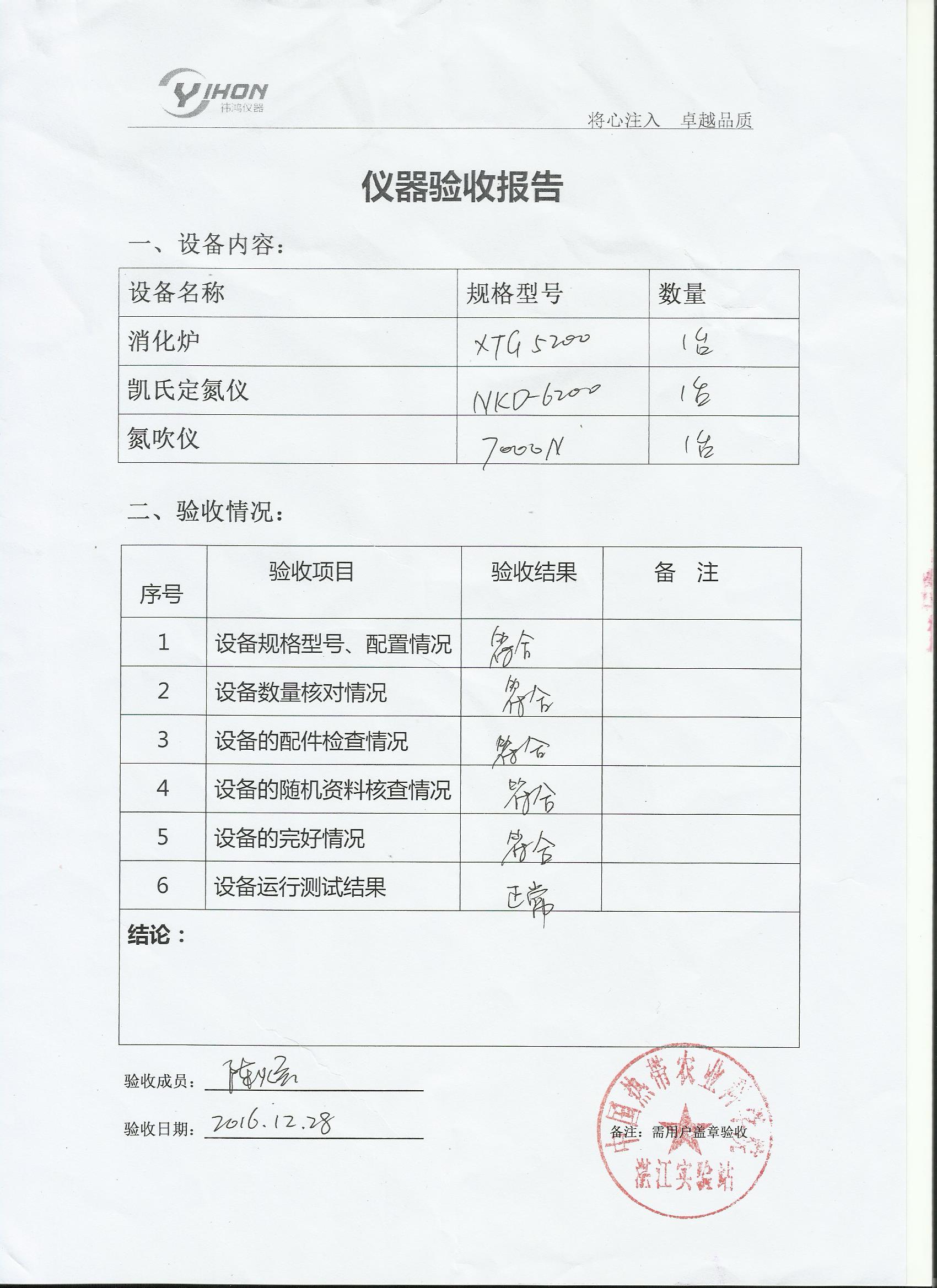 11月中旬中國熱帶農業科學院湛江實驗站選擇了與上海祎鴻分析儀器有限公司合作。采購我司NKD6200電位法凱氏定氮儀和XTG5200遠紅外消解儀,廣東湛江農林試驗站老師在選擇定氮儀特別慎重,經過多次技術交流,特別對電位滴定系統和紅外消解儀技術感興趣,反復多次試驗數據認證以及人性化友好操作界面深深的打動了老師,以及完善的銷售售前支持后售后服務解決方案,都得到了老師的認可。最終達成合作,我們將一如既往的服務好用戶,讓用戶滿意。