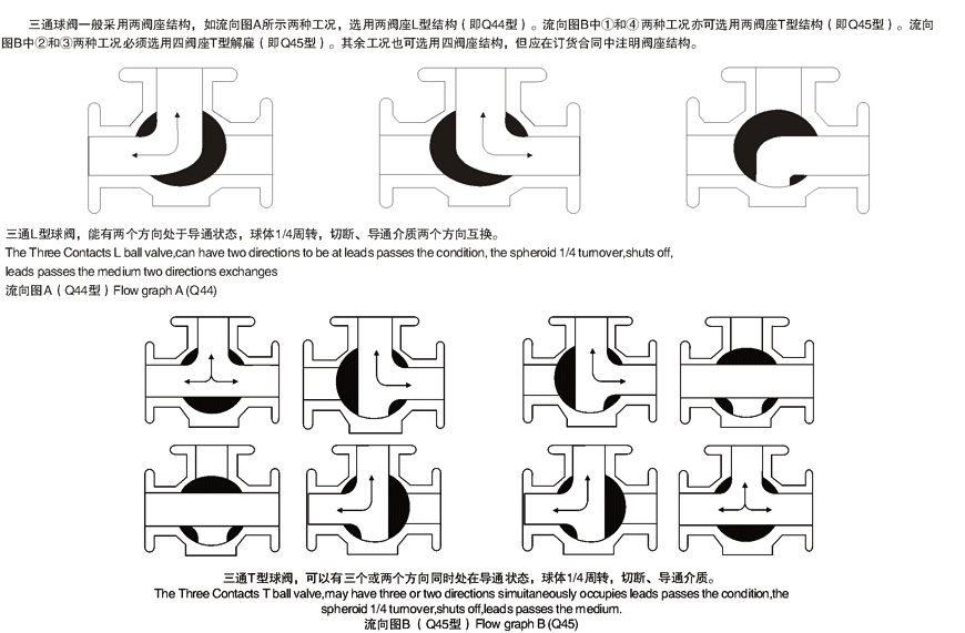 Q644氣動(dòng)法蘭L型三通球閥用于介質(zhì)流向的切換,能使相互垂直的兩個(gè)通道連通。三通球閥一般采用兩閥座結(jié)構(gòu),亦可根據(jù)用戶要求采用四閥座結(jié)構(gòu)。四閥座密封三通球閥具有造型美觀、結(jié)構(gòu)緊湊合理,它不僅可實(shí)現(xiàn)介質(zhì)流向的切換,也可使三個(gè)通道相互連通,同時(shí)也可關(guān)閉任一通道,使另外兩個(gè)通道連通,靈活控制管路中介質(zhì)的合流或分流。