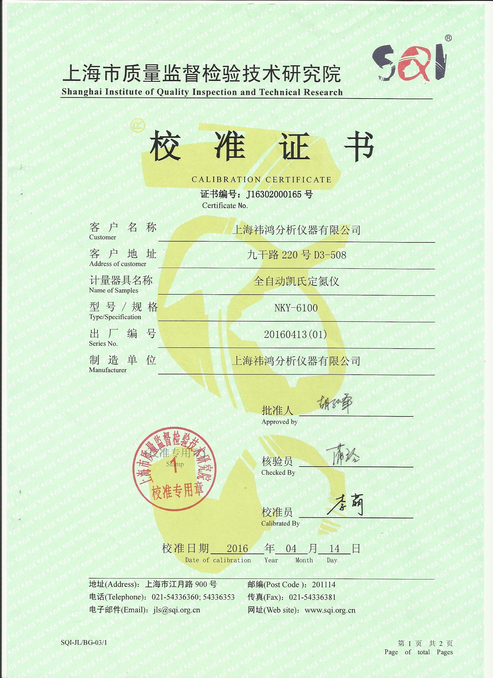 陽光明媚的5月,上海祎鴻分析儀器有限公司自主研發生產的全自動凱氏定氮儀NKY6100系列獲得了上海市質量監督檢驗技術研究院頒發的計量校準證書。